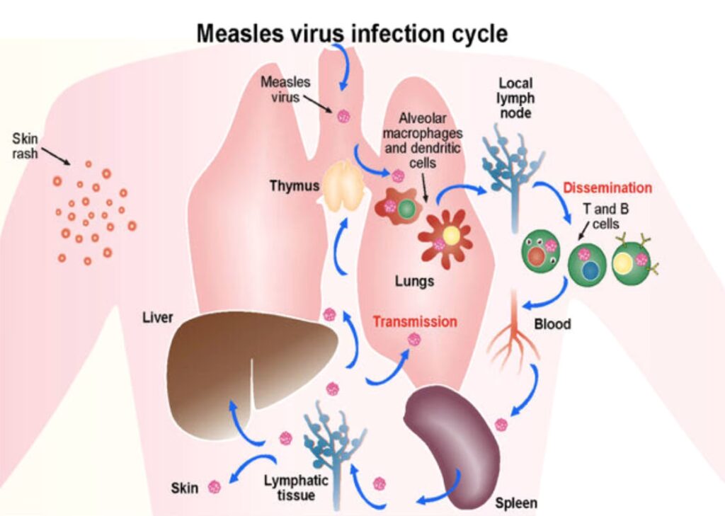 Mæslingevirussens effekt på kroppen er dybtgående. Efter at have inficeret luftvejene, angriber virussen immunceller som makrofager og dendritiske celler. Herfra bruger den lymfesystemet som en motorvej til at sprede sig til resten af kroppen, inklusiv milten, brislen og knoglemarven. Denne systemiske spredning (viræmi) er årsagen til de udbredte symptomer.