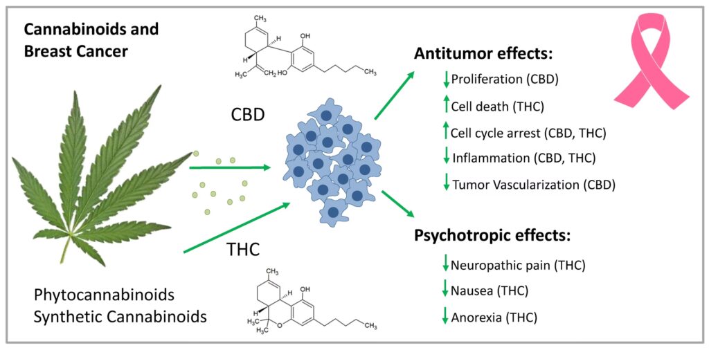 En af de mest studerede effekter er cannabinoiders evne til at bremse kræftcellers deling og vækst. Tidlige studier, især på gliomceller (en type hjernetumor), viste, at THC kunne standse cellernes cyklus. Denne effekt er siden blevet observeret i en lang række andre kræftcelletyper, herunder modermærkekræft, brystkræft, lungekræft og prostatakræft. En central mekanisme ser ud til at være hæmningen af et overlevelsesprotein kaldet Akt. Når Akt-signalvejen blokeres, forhindres kræftcellen i at fortsætte sin ukontrollerede deling.