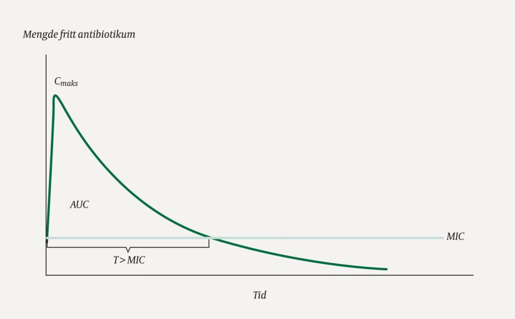 - Cmax/MIC: For koncentrationsafhængige antibiotika (f.eks. aminoglykosider) er målet at opnå en maksimal koncentration (Cmax), der er mange gange højere (typisk 8-10 gange) end MIC-værdien.