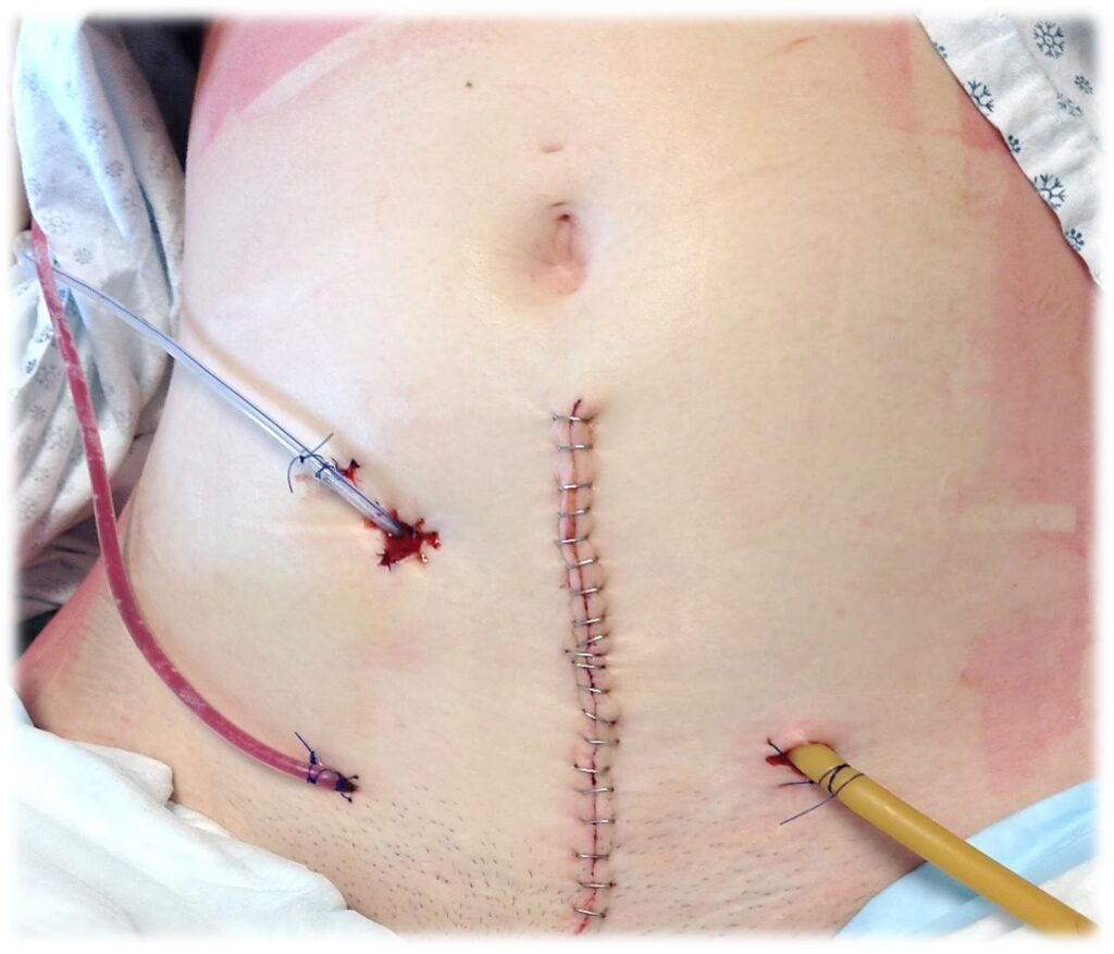 - Åben kirurgi: Kirurgen laver et større snit i den nederste del af maven for at få direkte adgang til organerne.