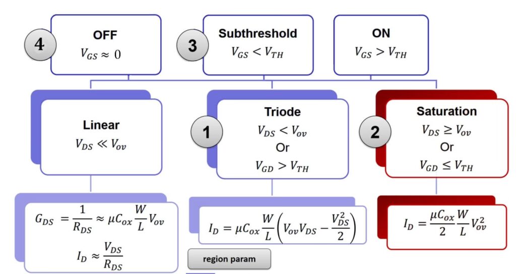 En MOSFET kan operere i tre forskellige regioner afhængigt af spændingerne på dens terminaler (V_GS og V_DS). Disse områder definerer dens opførsel som en switch eller forstærker.