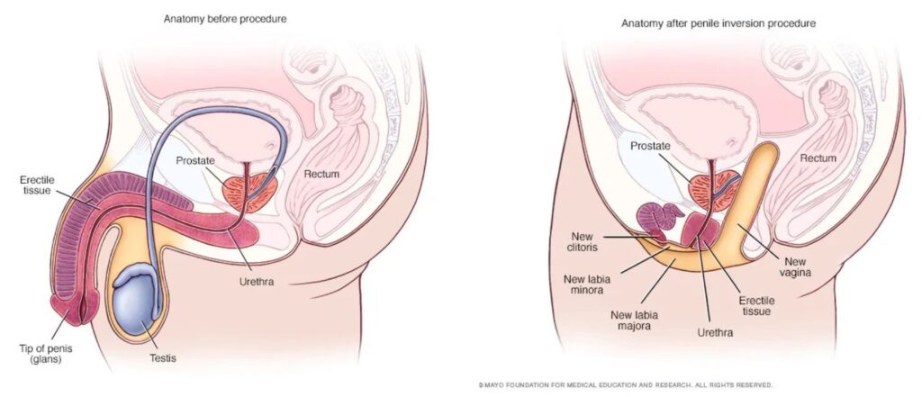 Dette er ofte det, de fleste forbinder med kønskorrigerende operationer. Målet er at fjerne de mandlige kønsorganer og konstruere kvindelige kønsorganer.