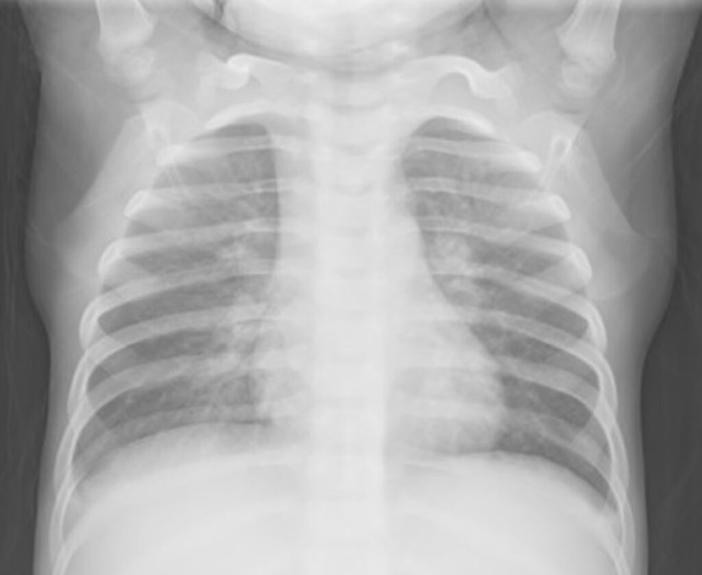 Røntgenbillede af brystet: Et røntgenbillede kan hjælpe med at bekræfte lungebetændelse. Fundene er ofte diffuse og plettede (interstitielle infiltrater), i modsætning til den mere afgrænsede lungebetændelse, man ser ved pneumokokker. Den danske undersøgelse viste dog, at hele 94% af de børn, der fik taget et røntgenbillede, havde forandringer, hvilket understreger, at infektionen ofte forårsager reel lungebetændelse.
