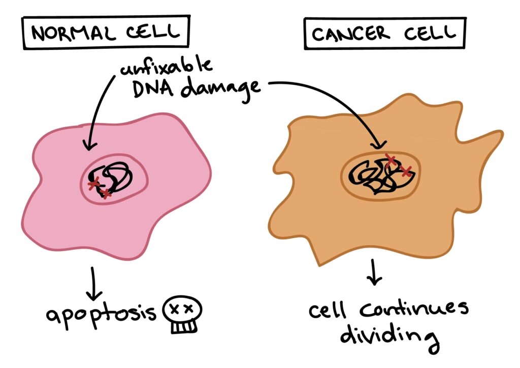 Når en celle er for gammel eller for beskadiget, skal den elimineres for kroppens bedste. Dette sker gennem apoptose, en pæn og kontrolleret proces. Specifikke gener er ansvarlige for at starte denne proces. Hvis disse gener muterer og bliver inaktive, kan en ellers dødsdømt celle overleve. En beskadiget celle, der skulle have ødelagt sig selv, fortsætter med at leve og dele sig, og overfører sine defekte gener til nye celler. Dette giver kræftceller en form for udødelighed.