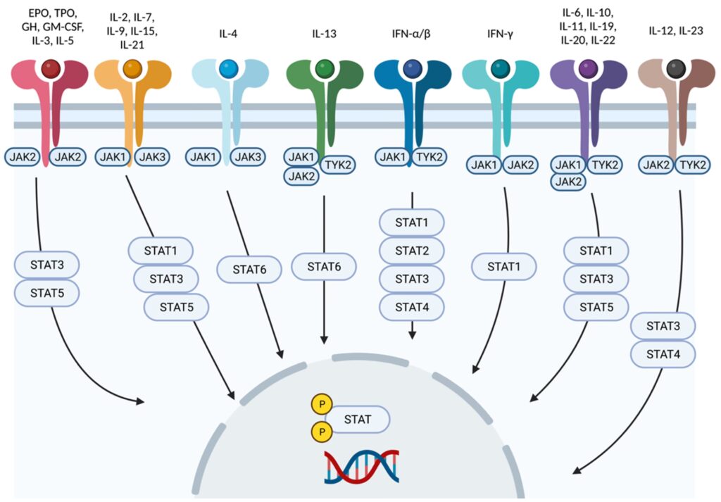 TYK2 er ikke involveret i signaleringen fra alle cytokiner. Dets rolle er ret specifik. Forskning har vist, at TYK2 er afgørende for signalveje drevet af vigtige cytokiner som IL-12, IL-23 og Type I Interferoner. Disse cytokiner er kendt for at være centrale drivkræfter i patofysiologien bag en række sygdomme: