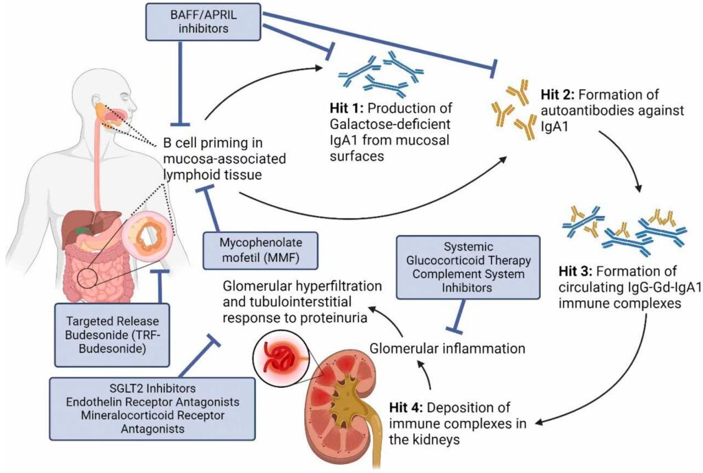 Sodium-glucose cotransporter-2 (SGLT2) hæmmere (f.eks. dapagliflozin, empagliflozin) blev oprindeligt udviklet til behandling af type 2-diabetes, men har vist sig at have en bemærkelsesværdig nyrebeskyttende effekt hos patienter med kronisk nyresygdom, herunder IgAN. DAPA-CKD-studiet viste, at dapagliflozin, givet oven i standard RAAS-blokade, markant reducerede risikoen for progression af nyresygdom, nyresvigt eller død. SGLT2-hæmmere forventes at blive en fast del af behandlingen for de fleste patienter med IgAN og vedvarende proteinuri.