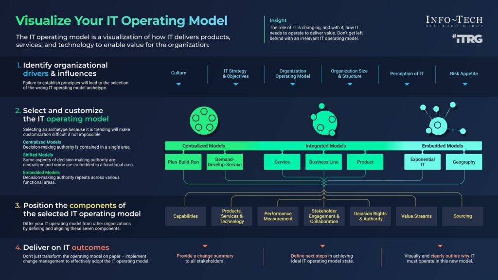 Når analysen af den nuværende tilstand er fuldført, er det tid til at definere den ønskede fremtidige driftsmodel. Dette er organisationens nye blueprint.