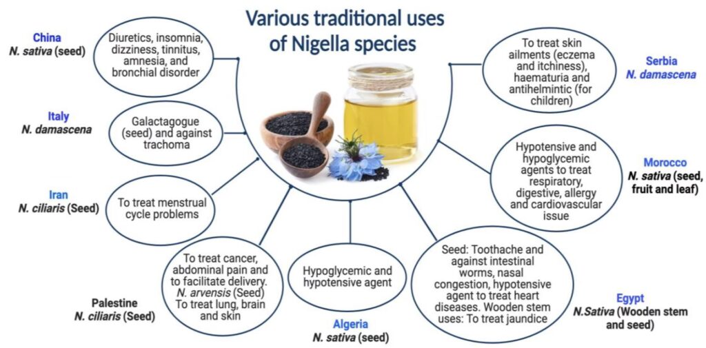 Men Nigella sativas betydning strækker sig langt ud over køkkenet. I årtusinder har den været en central del af traditionel medicin, herunder Ayurveda og Unani-medicin. Den blev betragtet som et universalmiddel, der kunne helbrede "alt undtagen døden". I moderne tid har videnskabelig forskning begyndt at validere nogle af disse gamle påstande. Studier har vist, at frøene og olien udvundet fra dem indeholder en række bioaktive stoffer, hvoraf det mest kendte og studerede er thymoquinon. Disse stoffer giver Nigella sativa stærke antioxidant-, antiinflammatoriske og immunmodulerende egenskaber, hvilket gør det til et interessant emne for behandling af en lang række sundhedsproblemer.