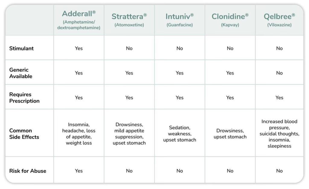 For at give et hurtigt overblik er her en sammenligningstabel over de primære ikke-stimulerende lægemidler.