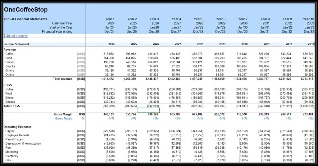 Vær så detaljeret som muligt. Opdel din prognose i forskellige produktkategorier (f.eks. varme drikke, kolde drikke, mad, merchandise) for at få et bedre overblik. Din evne til at skabe en troværdig omsætningsprognose vil være afgørende for at overbevise investorer og dig selv om projektets levedygtighed.
