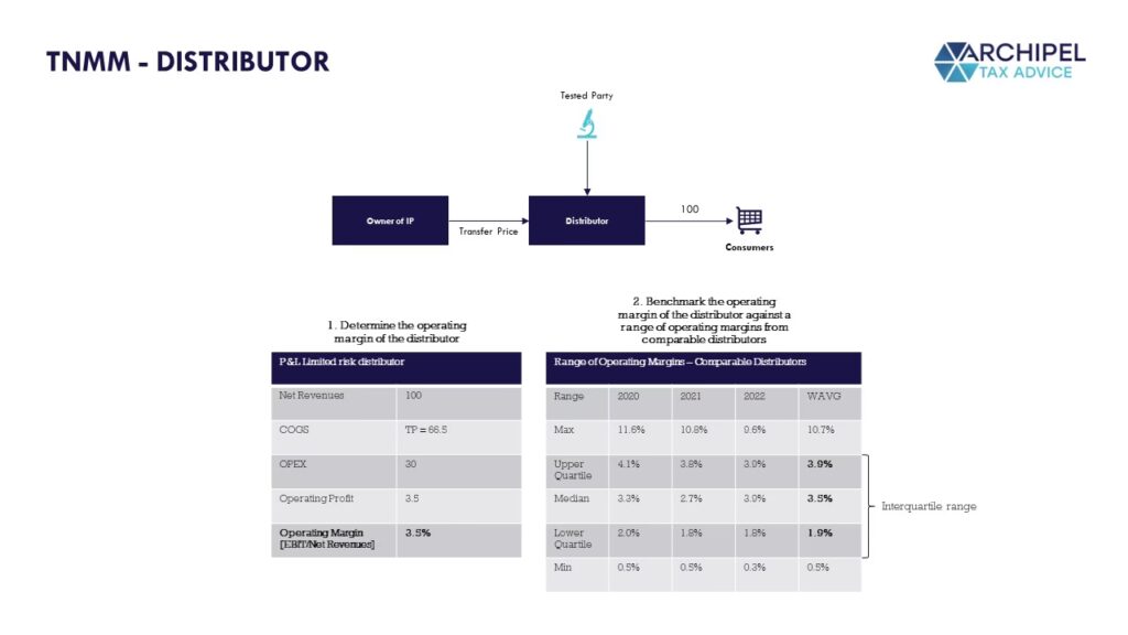 Eksempel: Dansk Service A/S leverer administrative ydelser til sit svenske søsterselskab. Det er blevet fastslået, at TNMM er den mest passende metode, og at driftsresultatet skal måles i forhold til de samlede omkostninger. En benchmark-analyse viser, at uafhængige serviceudbydere opnår en avance (driftsresultat/samlede omkostninger) på mellem 5% og 8%. Hvis Dansk Service A/S har samlede omkostninger på 2.000.000 kr. for at levere ydelserne, skal prisen fastsættes, så driftsresultatet lander inden for intervallet 100.000 kr. til 160.000 kr.
