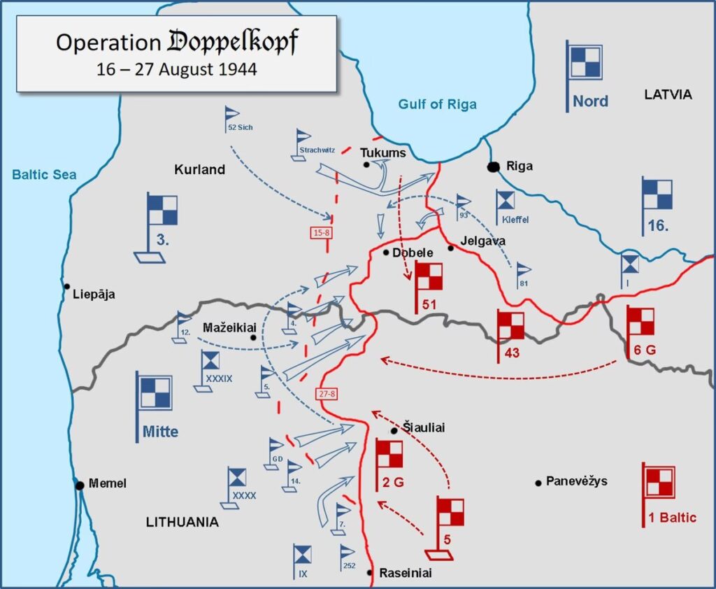 Planen, der blev udtænkt af Adolf Hitler selv, fik kodenavnet 'Doppelkopf' (Dobbelt Hoved), hvilket muligvis hentyder til de to panserkorps, der skulle udgøre spydspidserne i angrebet. Målet var todelt og ekstremt ambitiøst. Den primære opgave for Generaloberst Erhard Raus’s 3. Panserarmé var at angribe mod nordøst fra sit samlingsområde i det vestlige Litauen. Denne intervention skulle gennembryde de sovjetiske linjer og genoprette den livsvigtige landforbindelse til Heeresgruppe 'Nord'. Til denne opgave blev der samlet en betydelig panserstyrke, bestående af et pansergrenader- og fire panserdivisioner. Det er værd at bemærke, at to af disse panserdivisioner stadig var under transport fra Rumænien, hvor de havde udgjort den sidste reserve for Heeresgruppe 'Südukraine', hvilket understreger operationens høje prioritet.