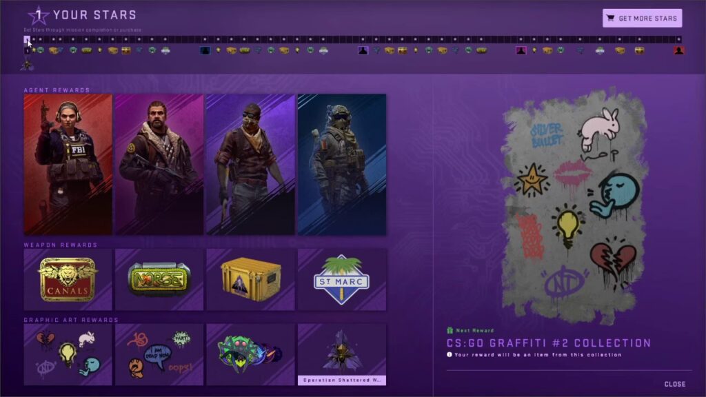 - Eksklusive Våbenkasser: Passet gav adgang til specielle 'cases', der indeholdt unikke våben-skins fra Shattered Web-kollektionen.