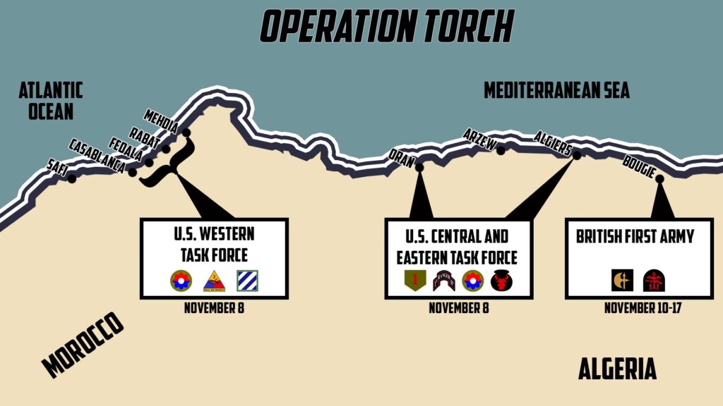 | Eastern Task Force | Algier | Generalmajor Charles W. Ryder | Mødte mindst modstand takket være et kupforsøg af den franske modstandsbevægelse. Byen og havnen blev hurtigt sikret. |