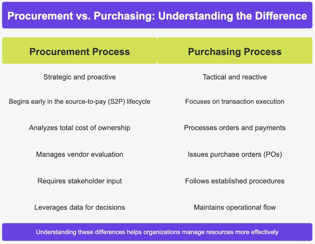 Traditionelt indkøb er primært reaktivt og fokuserer på kortsigtede mål, såsom at opnå den laveste pris for en given transaktion. Strategisk indkøb er proaktivt og fokuserer på at skabe langsigtet værdi ved at opbygge leverandørpartnerskaber, styre risici og optimere den samlede omkostning (Total Cost of Ownership).