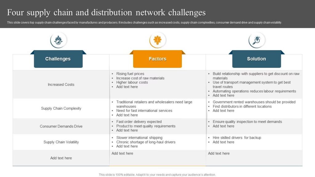 Selvom der er mange, er forstyrrelser i den globale forsyningskæde og opfyldelsen af de stadigt skiftende og stigende kundeforventninger (især med hensyn til leveringshastighed og gennemsigtighed) blandt de mest kritiske udfordringer. Håndteringen af disse kræver både agilitet og teknologisk innovation.