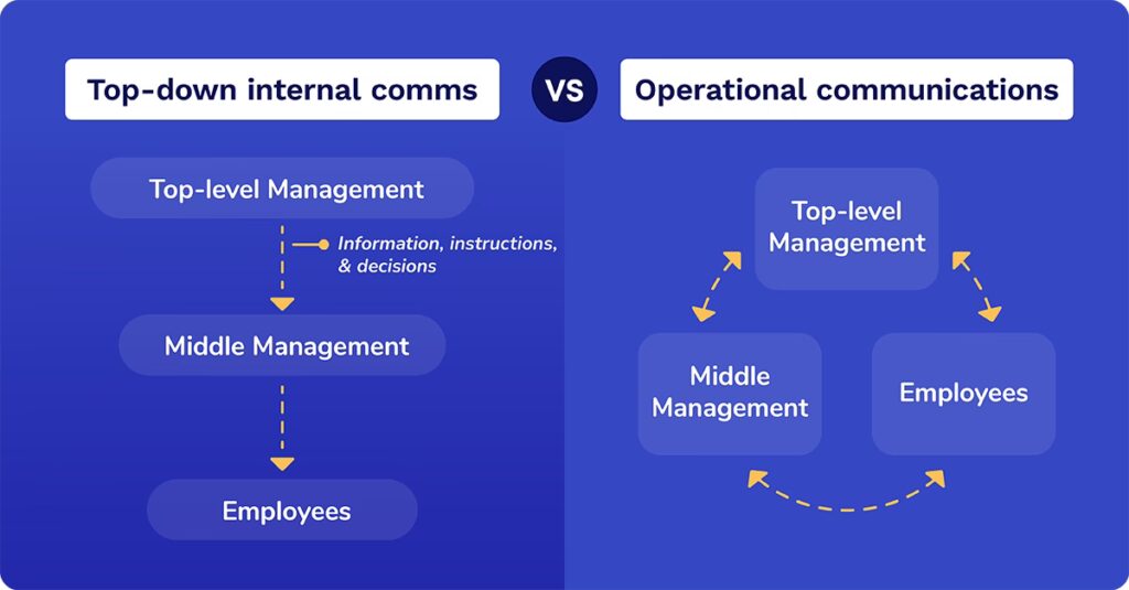 For at forstå dens transformative kraft, må vi først skelne mellem traditionel top-down intern kommunikation og den mere dynamiske, operationelle kommunikation. Traditionel kommunikation flyder ofte kun én vej: fra ledelsen og ned gennem hierarkiet via nyhedsbreve, opslagstavler eller e-mails. Medarbejderne er passive modtagere af information.