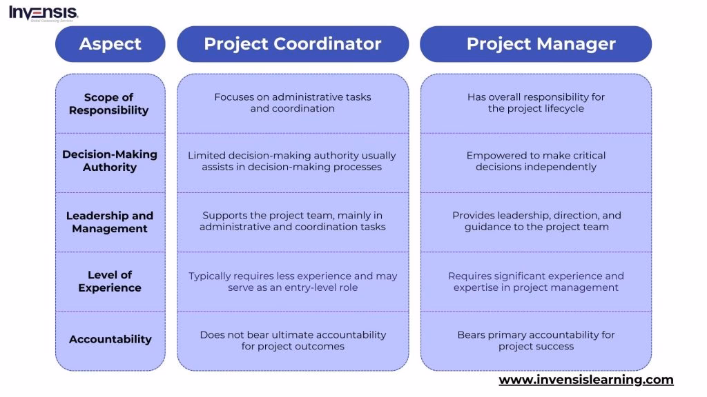 | Ansvarsområde | Fokuserer primært på administrative opgaver, koordinering og understøttelse af teamet. Arbejder på et taktisk niveau. | Har det overordnede ansvar for hele projektets livscyklus, fra planlægning til afslutning. Arbejder på et strategisk niveau. |