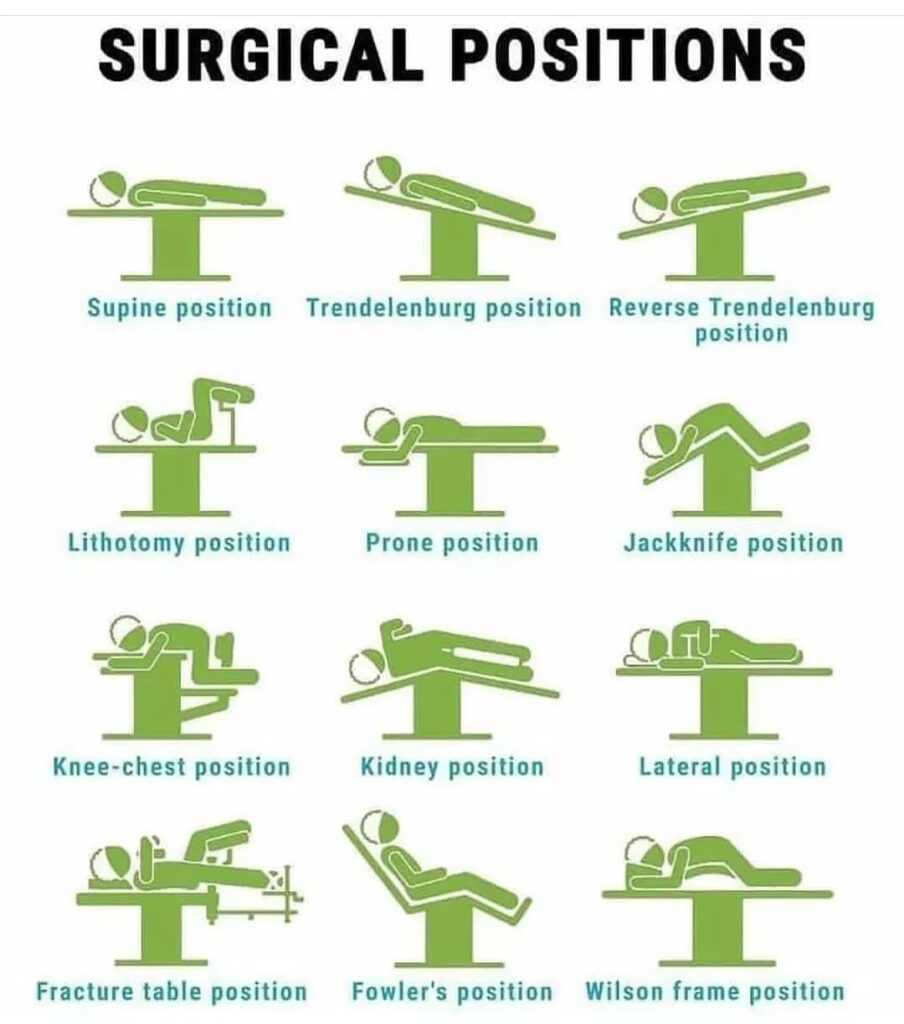 | Bugleje (Prone) | Ryg- og nakkekirurgi, neurokirurgi | Tryk på ansigt/øjne, nedsat lungekapacitet, kredsløbspåvirkning |