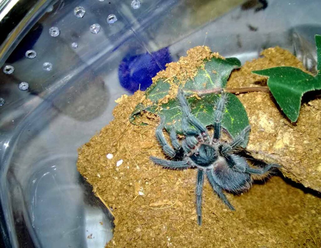 Hannen er typisk mindre og mere spinkel end hunnen, men har længere ben i forhold til kroppen. Det mest afgørende kendetegn ved en moden han er tilstedeværelsen af to apofyser, eller tibialkroge, på skinnebenet af det første par ben. Disse kroge bruges til at fiksere hunnens giftkroge under parringen for at beskytte sig selv. Hannerne besidder kun type I brændhår.