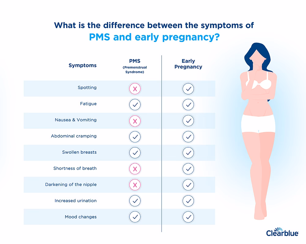 Mange af de tidlige tegn på graviditet kan forveksles med PMS-symptomer. Tabellen nedenfor kan hjælpe med at skelne mellem dem.