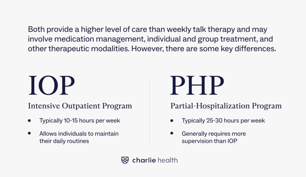 Et IOP kan være det næste skridt for en person, der har afsluttet et PHP-forløb og er klar til mere selvstændighed, eller for en person, hvis symptomer er alvorlige, men ikke kræver den daglige intensitet, som et PHP tilbyder. Ligesom PHP inkluderer IOP typisk en kombination af individuel terapi, gruppesessioner og færdighedstræning. Der er dog generelt mindre medicinsk tilsyn sammenlignet med et PHP, da fokus primært ligger på de terapeutiske interventioner og på at integrere nye færdigheder i hverdagen.
