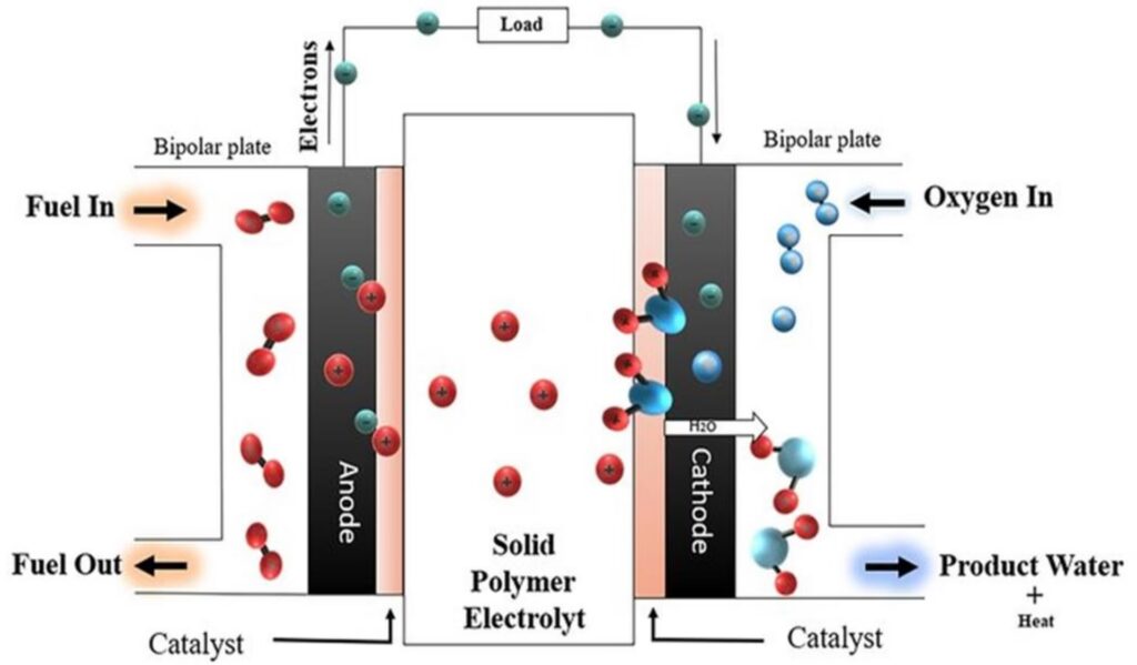 En PEM-elektrolysator (PEMWE) er en avanceret type elektrolysecelle, der anvender en fast polymermembran som elektrolyt. Denne membran, kendt som en protonudvekslingsmembran, er i stand til at lede positivt ladede protoner (H+), mens den blokerer for elektroner og gasser som ilt og brint. Cellen fungerer ved, at deioniseret vand ledes til anoden (den positive elektrode), hvor det spaltes til ilt, protoner og elektroner. Protonerne transporteres gennem membranen til katoden (den negative elektrode), hvor de reagerer med elektroner fra det eksterne kredsløb for at danne ren brintgas. En afgørende egenskab ved PEM-teknologien er, at det sure miljø i membranen kræver brug af ædelmetalkatalysatorer, typisk baseret på iridium og platin, for at modstå de barske forhold og facilitere de kemiske reaktioner. Selvom dette medfører højere startomkostninger, tilbyder PEMWE betydelige fordele som hurtig opstart, evnen til at håndtere svingende strøm fra vedvarende energikilder og produktion af brint under højt tryk, hvilket reducerer behovet for efterfølgende kompression.