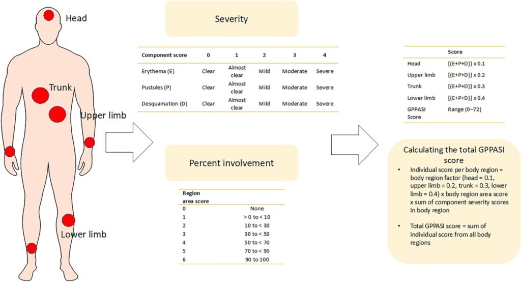 PASI er ofte blevet betragtet som "guldstandarden" inden for klinisk forskning. Det er et meget detaljeret system, der giver en samlet score baseret på fire kropsregioner (hoved, arme, krop og ben). For hver region vurderer lægen tre parametre: rødme (erytem), fortykkelse (induration) og skældannelse (desquamation). Disse scores kombineres med en vurdering af, hvor stort et hudområde der er påvirket i hver region. Resultatet er en score, der kan variere fra 0 (ingen psoriasis) til 72 (mest alvorlig tænkelig psoriasis).