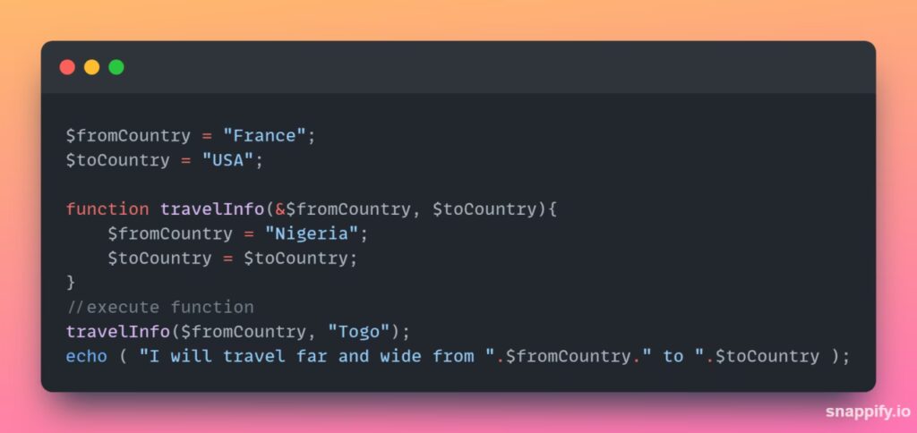 <?php function tilfoejEn(&$tal) { $tal += 1; } $mitTal = 5; tilfoejEn($mitTal); echo $mitTal; // Output: 6 ?>Uden &-tegnet i funktionsdefinitionen ville funktionen have arbejdet på en kopi af $mitTal, og den originale variabel ville forblive uændret.