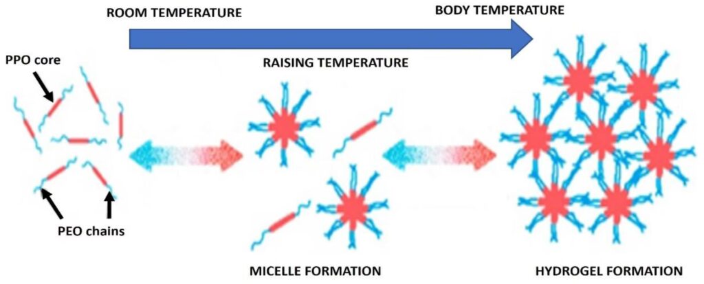 En af de mest interessante egenskaber ved Poloxamer 407 er dens termoreversible geldannelse. Det betyder, at det kan være flydende ved lave temperaturer (f.eks. i køleskabet) og omdannes til en fast gel ved kropstemperatur. Denne egenskab er særligt værdifuld i medicinske anvendelser, hvor et lægemiddel kan injiceres som en væske og derefter danne et gel-depot inde i kroppen, hvorfra det aktive stof langsomt frigives.