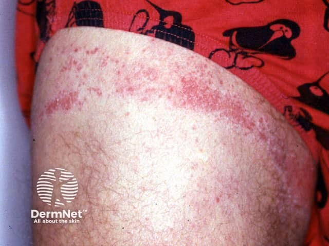 Reaktionen opstår typisk på områder af kroppen, hvor tøjet sidder tæt, eller hvor der er meget friktion og sved, såsom armhuler, lysken, bagsiden af knæene og i halsudskæringen.