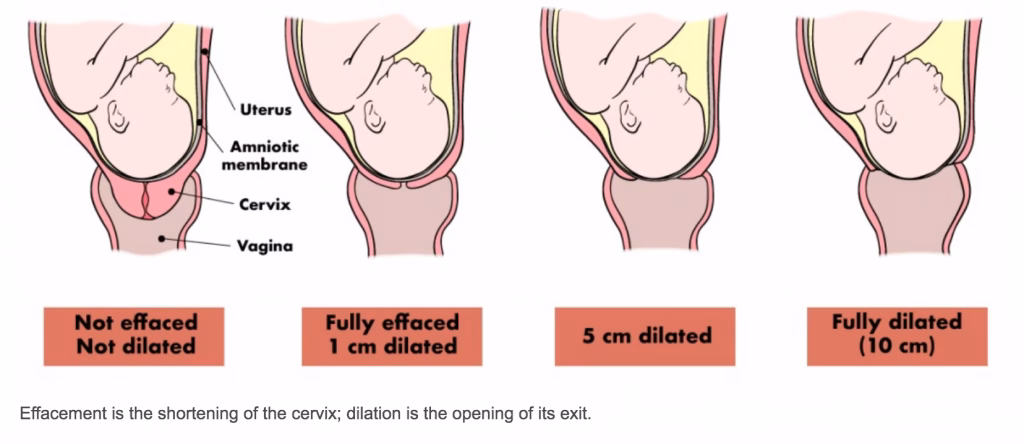 | Livmoderhalsens ændring | Ingen ændring | Minimal afkortning, lidt eller ingen udvidelse | Progressiv afkortning og udvidelse |
