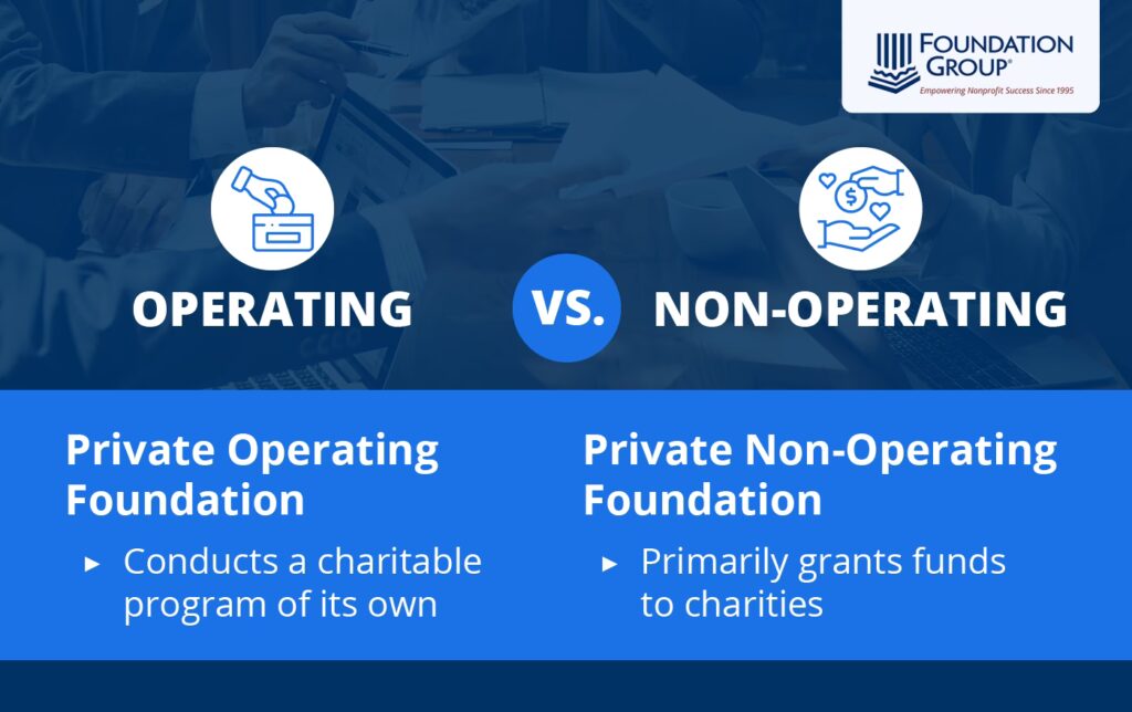 Alle private fonde betragtes som udgangspunkt som ikke-operative. For at blive anerkendt som en operativ fond (POF), skal en fond bevise, at dens primære funktion er at drive offentlige velgørende programmer. Dette gøres gennem en række tests, der måles over en fireårig periode.