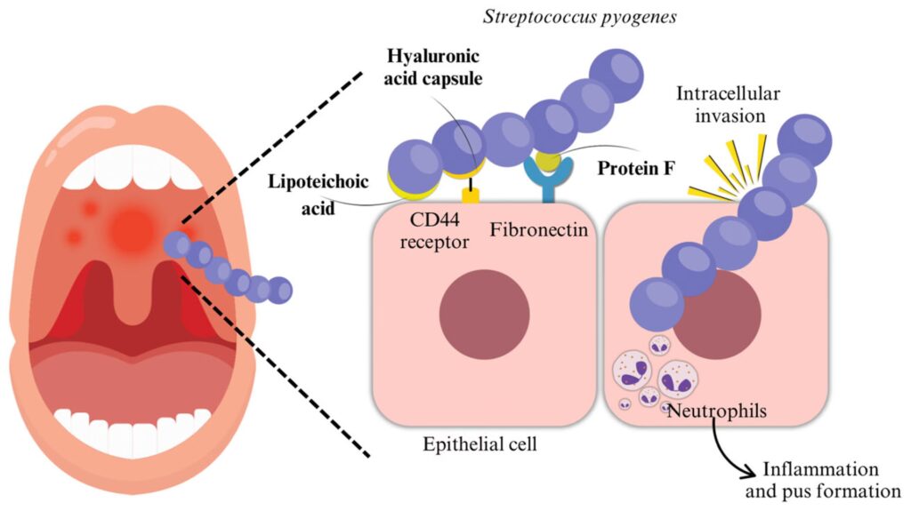 For at kunne forårsage nogen af disse sygdomme skal bakterien først overvinde kroppens forsvar og etablere sig på en overflade, f.eks. slimhinden i halsen. Dette første, kritiske skridt kaldes adhæsion.