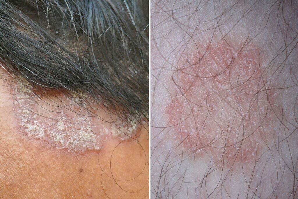 De mest typiske symptomer er skarpt afgrænsede, røde hudområder dækket med sølv-hvide skæl. Dette ledsages ofte af en strammende fornemmelse og intens kløe i hovedbunden.