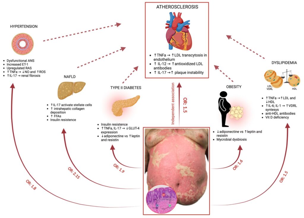 Ud over den direkte inflammatoriske forbindelse deler psoriasis og hjerte-kar-sygdomme flere fælles risikofaktorer. Personer med psoriasis har en højere forekomst af tilstande, der i sig selv øger risikoen for hjerteanfald. Disse kaldes komorbiditeter.
