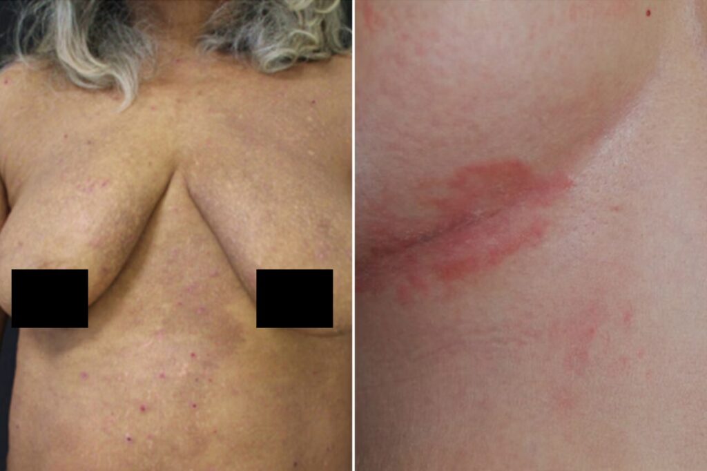 Udslættet ser ofte skinnende og glat ud og kan have en dybrød, lilla eller brunlig farve afhængigt af hudtonen. Huden føles ofte øm, og der kan opstå små revner eller sprækker, som kan være smertefulde og øge risikoen for infektion.
