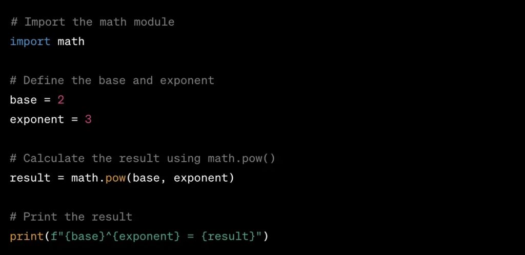 Inden for Pythons math-bibliotek findes der også en math.pow()-funktion. Denne funktion er specifikt designet til at arbejde med flydende kommatal (floats) og kan være særligt nyttig, når du arbejder med ikke-heltalsbaser eller eksponenter og kræver høj præcision.