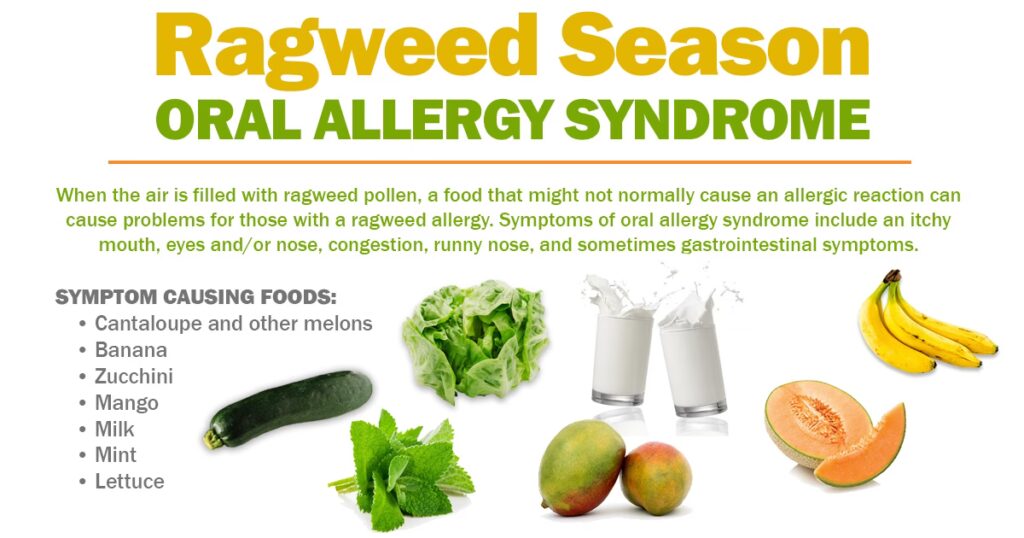Nogle mennesker med bynkeallergi oplever en reaktion, når de spiser visse rå frugter, grøntsager eller nødder. Dette kaldes Oralt Allergisyndrom (OAS). Det sker, fordi proteinerne i disse fødevarer ligner proteinerne i bynkepollen så meget, at immunsystemet forveksler dem og udløser en allergisk reaktion. Symptomerne er typisk milde og begrænset til munden og halsen, såsom kløe eller en prikkende fornemmelse. Fødevarer, der ofte er forbundet med bynkeallergi, inkluderer bananer, meloner (især cantaloupe og vandmelon), agurker og zucchini. Tilberedning af disse fødevarer nedbryder normalt proteinerne og forhindrer en reaktion.