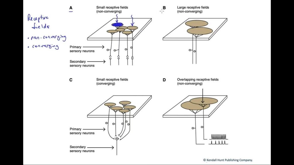 - I centrum af synsfeltet (fovea): Her, hvor vores syn er skarpest, er de receptive felter ekstremt små. Dette giver os mulighed for at se fine detaljer, som når vi læser en bog eller genkender et ansigt på afstand. Hver neuron er dedikeret til et meget lille område, hvilket giver en høj opløsning.