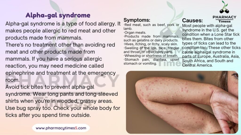 Den mest kendte form for allergi over for rødt kød (okse, lam, svin) er forårsaget af en reaktion på et sukkerstof kaldet galaktose-alfa-1,3-galaktose, bedre kendt som alfa-gal. Dette sukker findes i kødet fra næsten alle pattedyr, undtagen mennesker og primater. Interessant nok udløses denne allergi ofte af et bid fra en flåt. Når flåten bider et pattedyr og derefter et menneske, kan den overføre alfa-gal-sukkeret til personens blodbane, hvilket får immunsystemet til at udvikle følsomhed. Personer med blodtype A eller O ser ud til at have en højere risiko for at udvikle denne allergi.