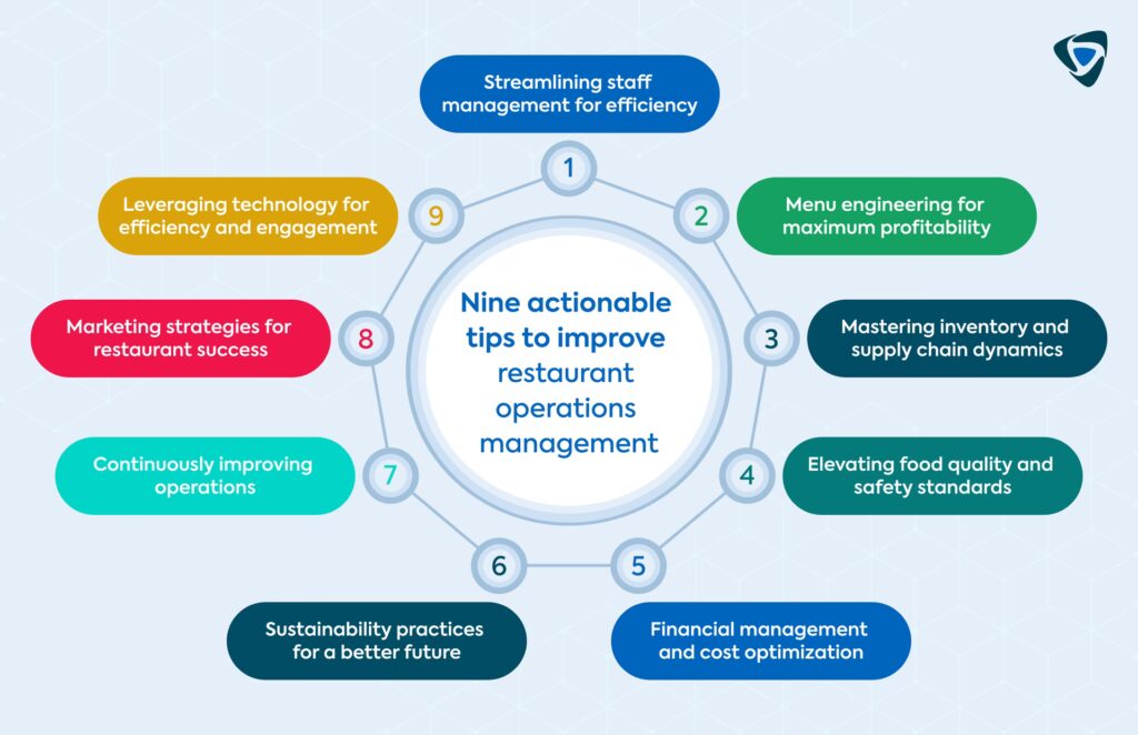 Måderne at forbedre restaurantdriften på er følgende: Skab et system for restaurantdrift, skab et godt arbejdsmiljø, effektiv personaleplanlægning, gør din menu mere tiltalende, foretag omhyggelig lageroptælling, administrer dine udgifter, vær opmærksom på dine gæster og husk at inkludere markedsføringsledelse.