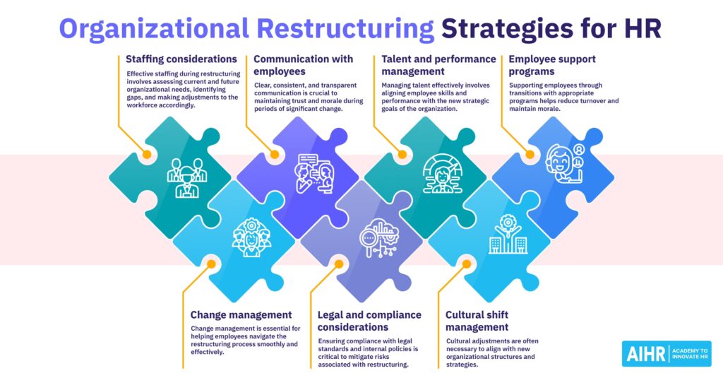 A business can restructure in many different ways. The different types of restructuring include legal restructuring, turnaround restructuring, cost restructuring, divestment, spin-off, repositioning restructuring, and mergers and acquisitions. Does Restructuring Mean Layoffs?