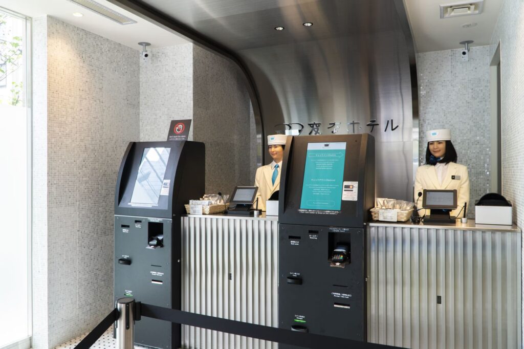 Ved ankomsten til Henn-na Hotel bliver gæsterne straks konfronteret med det usædvanlige. Bag receptionsdisken finder man ikke mennesker, men et udvalg af flersprogede robotter klar til at tjekke dig ind. Den mest iøjnefaldende er uden tvivl den engelsktalende dinosaur-robot, komplet med hat og butterfly, som med sin dybe stemme guider gæsterne gennem indtjekningsprocessen via en tablet. Ved siden af den kan man finde yderst realistiske humanoide robotter. Med deres fejlfri porcelænshud, rolige smil og elegante uniformer ligner de næsten mennesker. De blinker, nikker og kan besvare simple spørgsmål om vejret, hvilket skaber en på én gang fascinerende og lettere surrealistisk atmosfære.