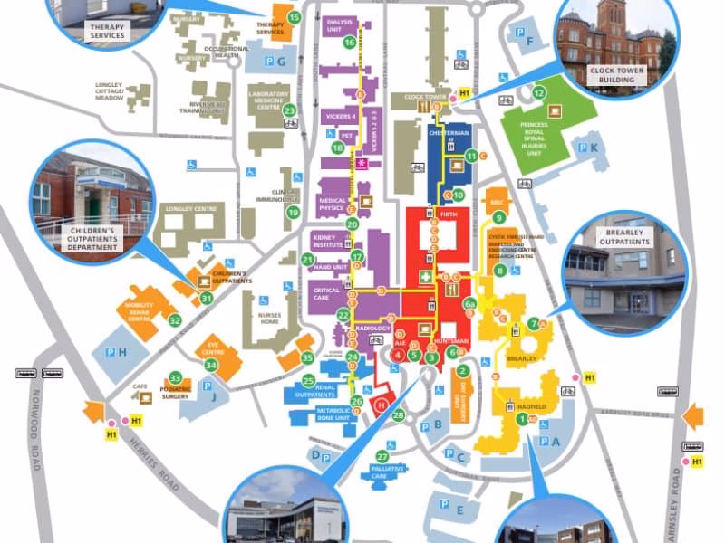 Kommer du til Sheffield fra syd ad A61, skal du fortsætte ind mod byen. Lige efter du har passeret en stor Halfords-butik, skal du dreje til venstre ad Bramall Lane (A621). Du vil have fodboldstadionet på din højre side. Ved den efterfølgende rundkørsel skal du tage den første afkørsel og følge A61 mod Barnsley. Herfra vil du også hurtigt se skiltning mod hospitalerne.