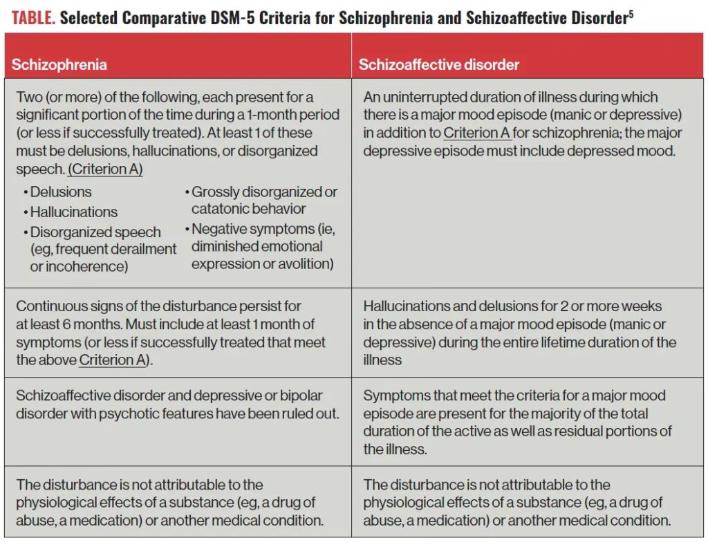 Selvom de kan lyde ens, er der afgørende forskelle. Skizofreni er primært defineret ved psykotiske symptomer og en nedgang i social og erhvervsmæssig funktion. Humørsymptomer kan forekomme, men de er ikke en central og vedvarende del af sygdomsbilledet. Ved skizoaffektiv lidelse er humørsvingningerne derimod en fundamental og dominerende del af sygdomsforløbet og skal være til stede i størstedelen af den samlede sygdomsperiode.