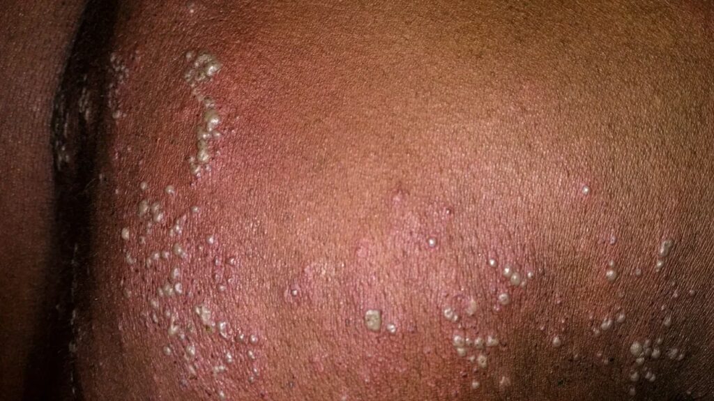 | Blærer (Vesikler) | Klare, væskefyldte blærer på en rød base. | Klare, væskefyldte blærer, men basen er muligvis ikke synligt rød. Blærerne i sig selv er et vigtigt tegn. |