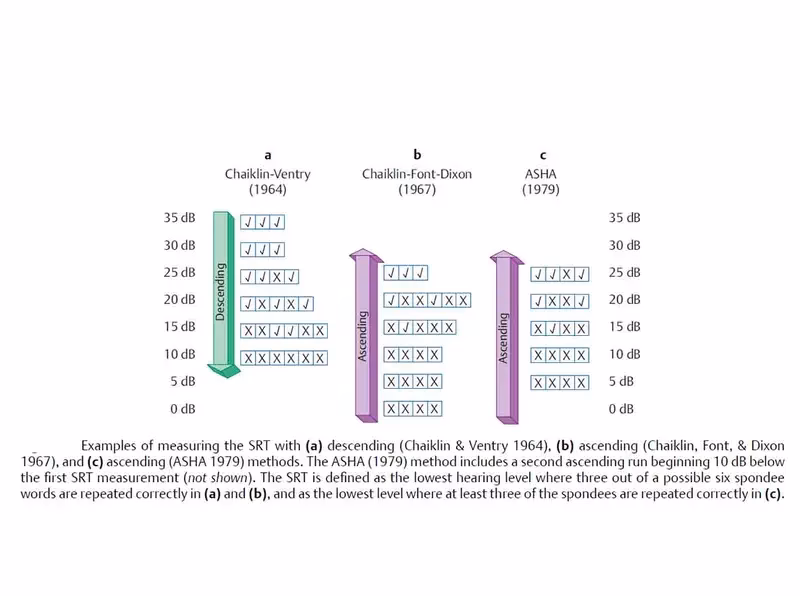 SRT-værdien sammenlignes med gennemsnittet af ren-tone tærsklerne ved 500, 1000 og 2000 Hz (Pure Tone Average, PTA). Hvis SRT og PTA stemmer overens (inden for +/- 10 dB), bekræfter det testens pålidelighed. Dette er kendt som krydstjek-princippet.