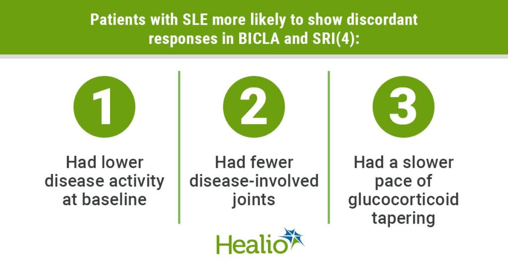 Background The SRI (4) is a composite endpoint used in SLE clinical trials. A post-hoc analysis of two Phase III studies of belimumab 1 showed that the achievement of an SRI (4) response at 52 weeks is associated with clinically meaningful benefits, irrespective of the treatment assignments.
