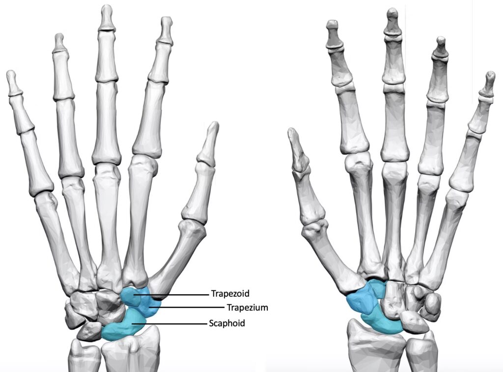 | Involverede knogler | Scaphoideum, Trapezium, Trapezoideum | Trapezium og 1. metakarp (tommelfingerens mellemhåndsknogle) |